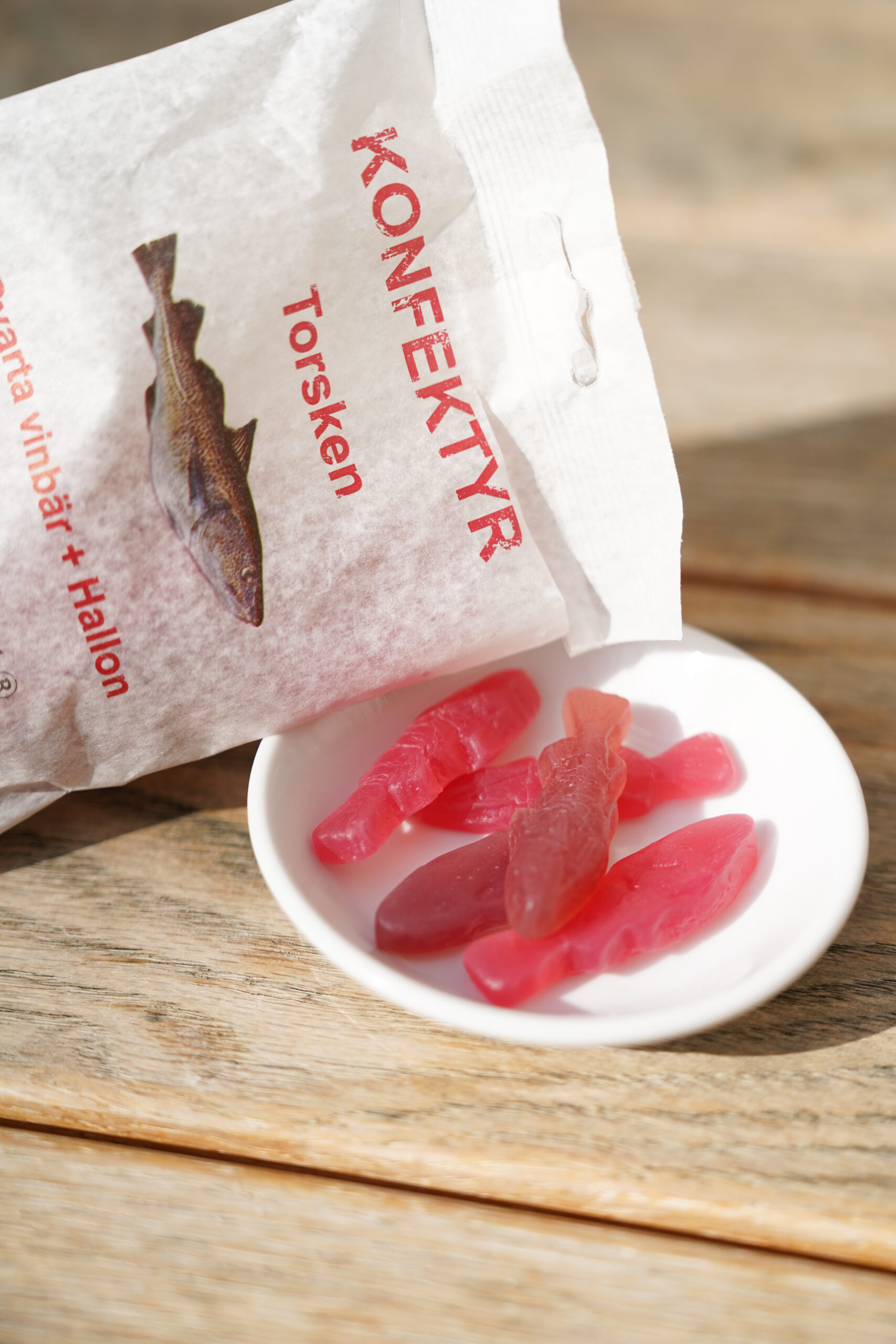 Un assortiment de bonbons aux goûts de cassis et de framboise en forme de « torsken » (cabillaud).