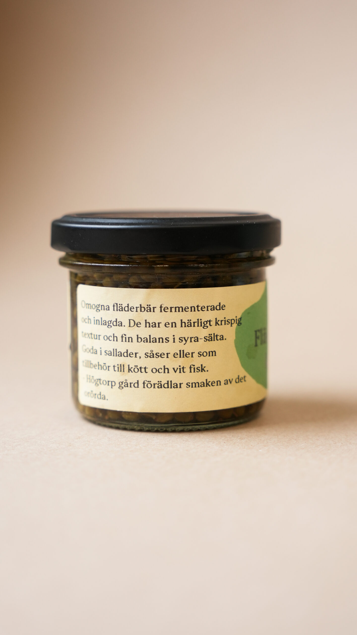 Baies de sureau vertes, fermentées et marinées. Elles offrent une texture croquante et un bel équilibre entre acidité et saveur salée. Parfaites dans les salades, les sauces ou en accompagnement de viandes et de poissons blancs.